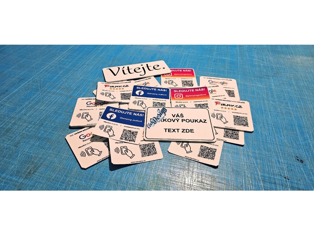 Stačí cedulky a samolepky rozmístit na pobočkách, recepci, pokojích, pokladnách, stolech, dveřích nebo WC – lidé začnou snadno procházet Vaše profily 📱
